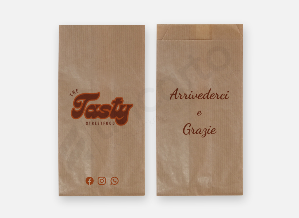 nostri sacchetti in carta per alimenti possono essere personalizzati con il tuo logo o immagine, stampati a uno o due colori, per un packaging pratico e riconoscibile.